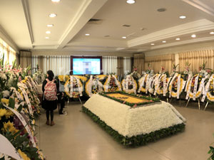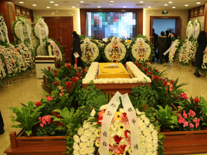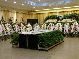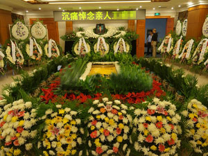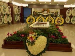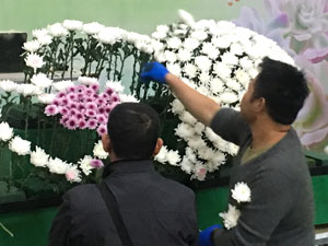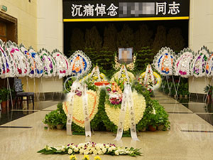 告别厅内遗体鲜花、花圈、横幅、灯光、音响、祭奠品等相关物品的摆放,与家属最后确认无误。